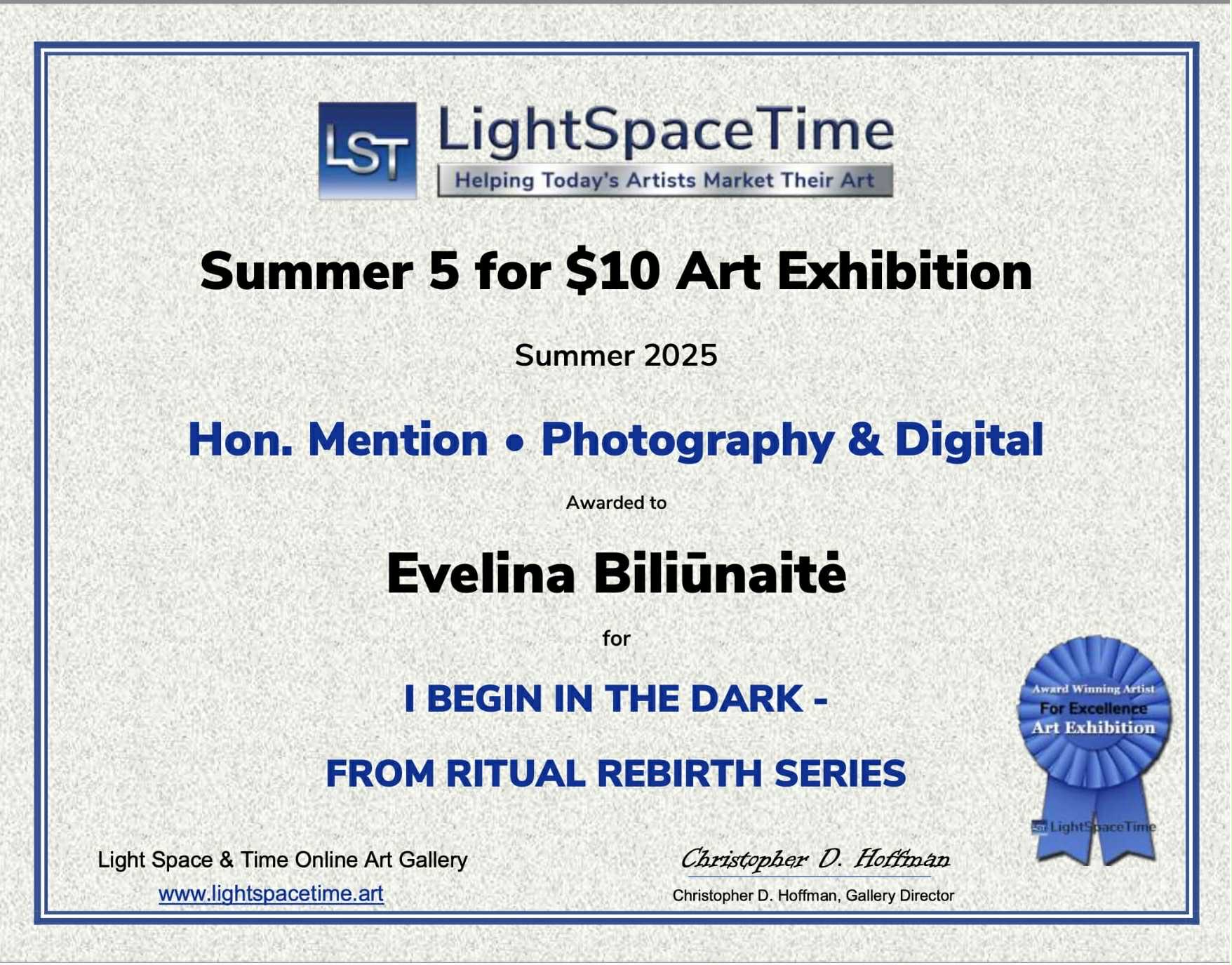 Evelina Biliūnaitė – MIRKONA, a digital artist from Lithuania, was selected as an Honorable Mention finalist in the 2025 "Summer 5 for $10" Online Art Exhibition, hosted by the Light Space & Time Online Art Gallery, with her artwork "I Begin in the Dark" from the From Ritual Rebirth series.