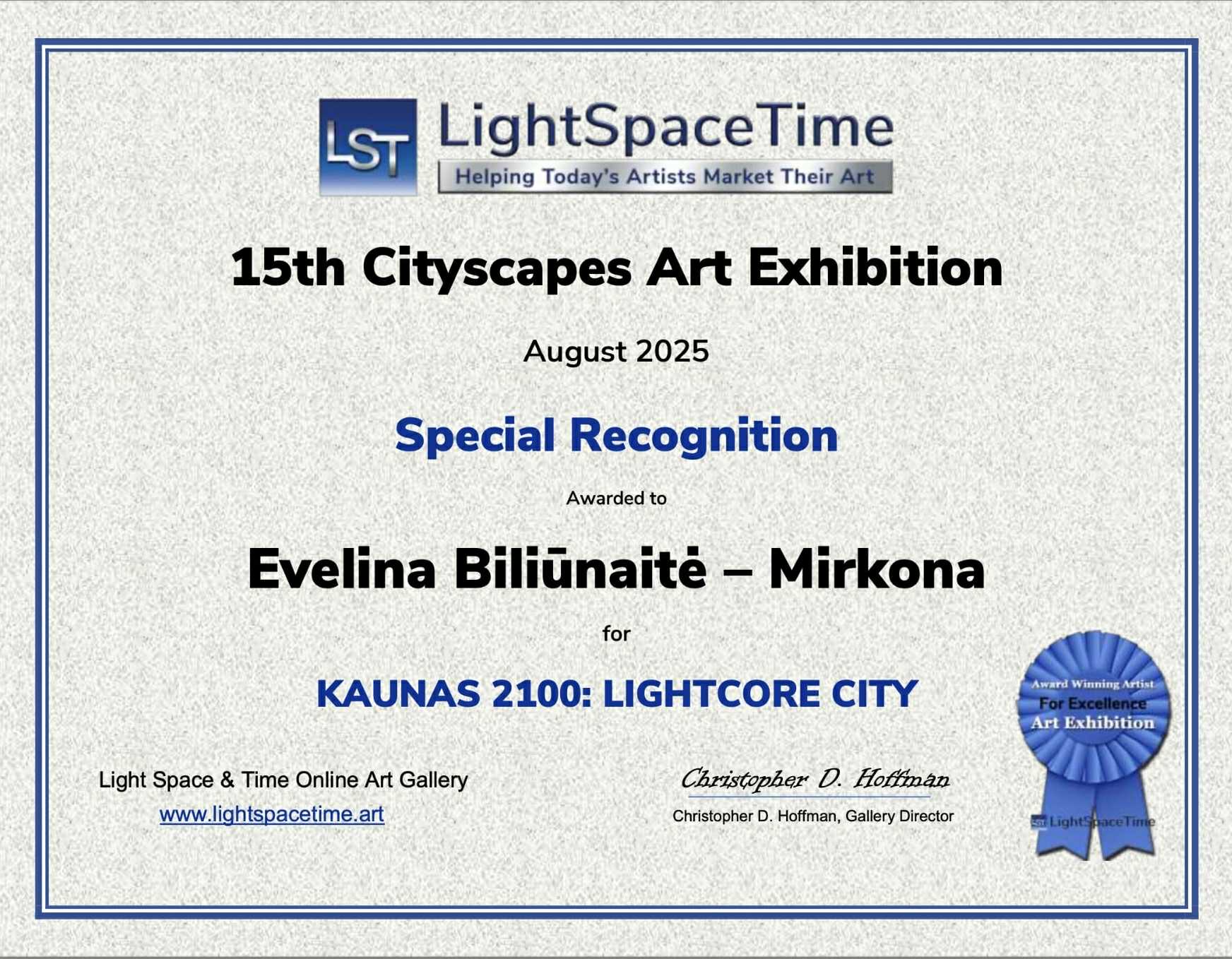 Evelina Biliūnaitė – MIRKONA, a digital artist from Lithuania, has entered the final of the 15th Annual Cityscapes Art Exhibition with her work "Kaunas 2100: Lightcore City" and has been honored with a Special Recognition Award in the Photography & Digital Art category.